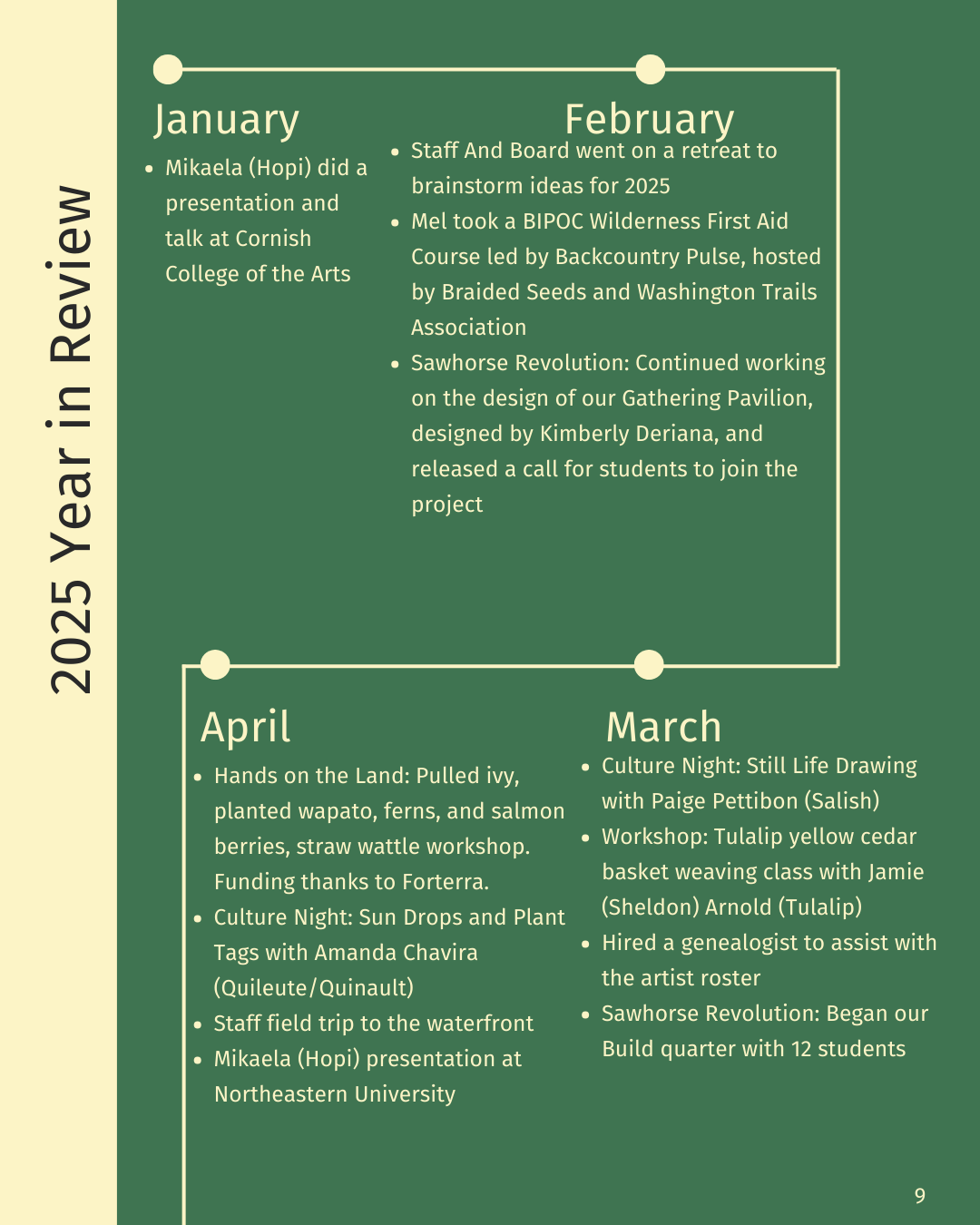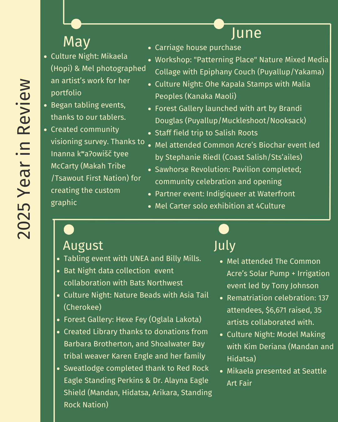 Genealogist Josie Lundquist (Lower Elwha Klallam/Confederated Salish and Kootenai descent) joined our team in 2025 to support our artists and community members in gathering essential documents for tribal identification and cultural reconnecting. So far, she has successfully researched over seven family trees from tribes across the US.