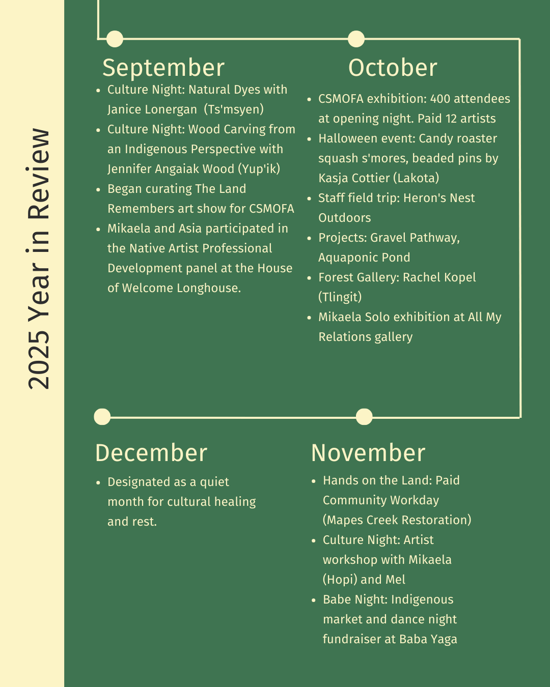 Community Engagement: Welcomed over 2,912 visits to the land, hosted over 140 events, including cultural activities, workshops, youth programs, retreats, and art events.